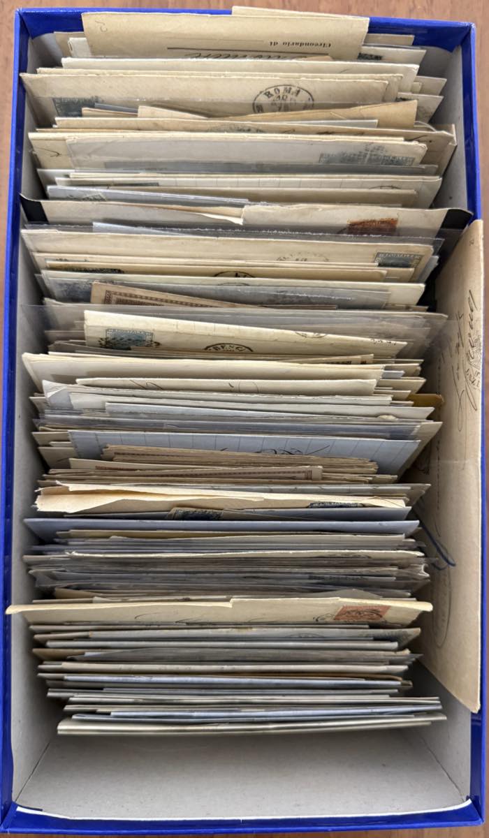 REGNO D'ITALIA 1863/1885 - Alcune centinaia di cartoline postali o lettere affrancate con francobolli del periodo, senza significative presenze, in una scatola.