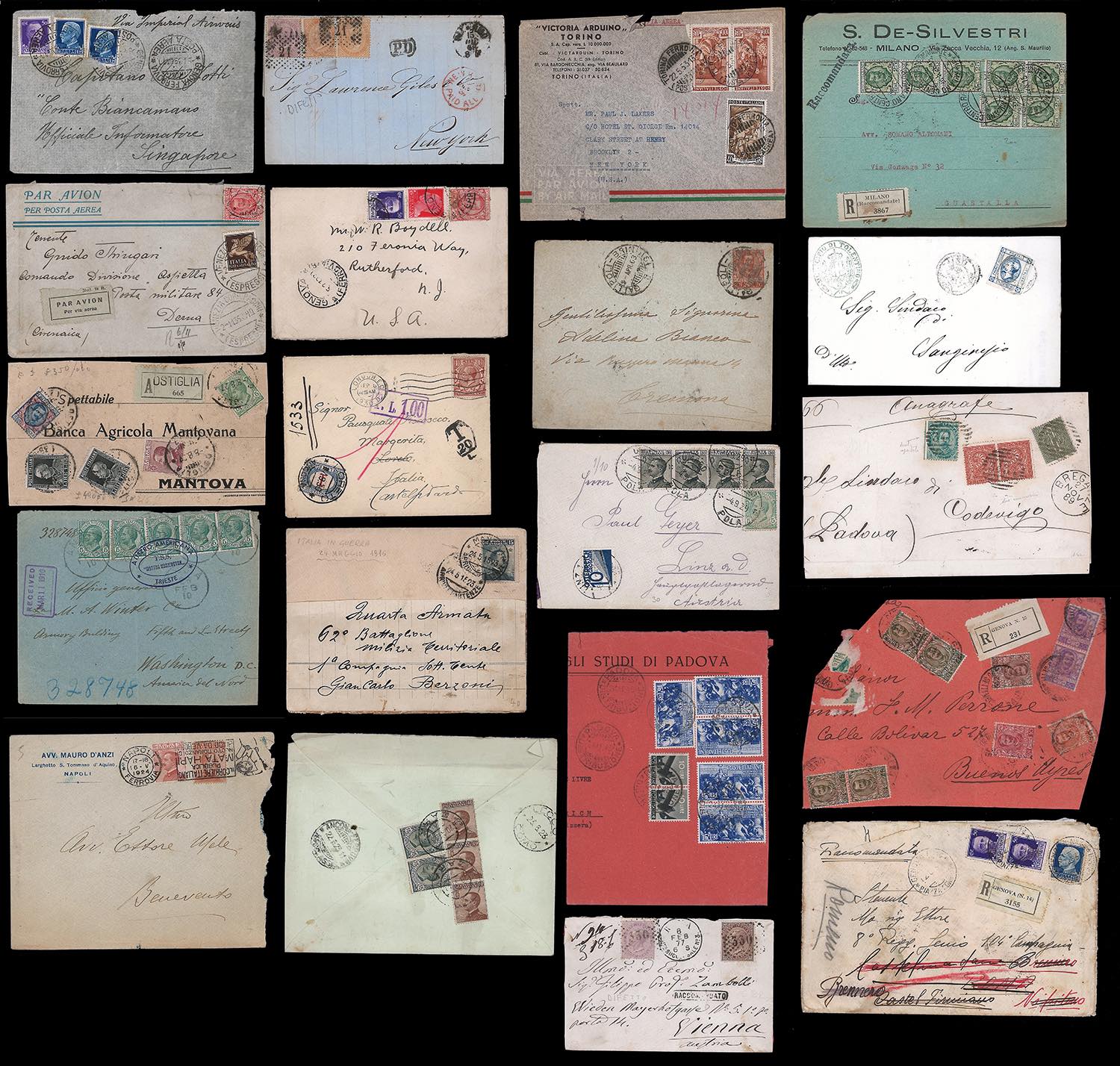 REGNO D'ITALIA/REPUBBLICA ITALIANA 1863/1953 - Piccolo ma selezionato insieme di lettere del periodo con interessanti affrancature e destinazioni. Notato un frontespizio con affrancatura pentacolore della Floreale per Buenos Aires. Merita esame.