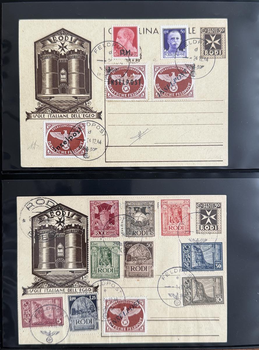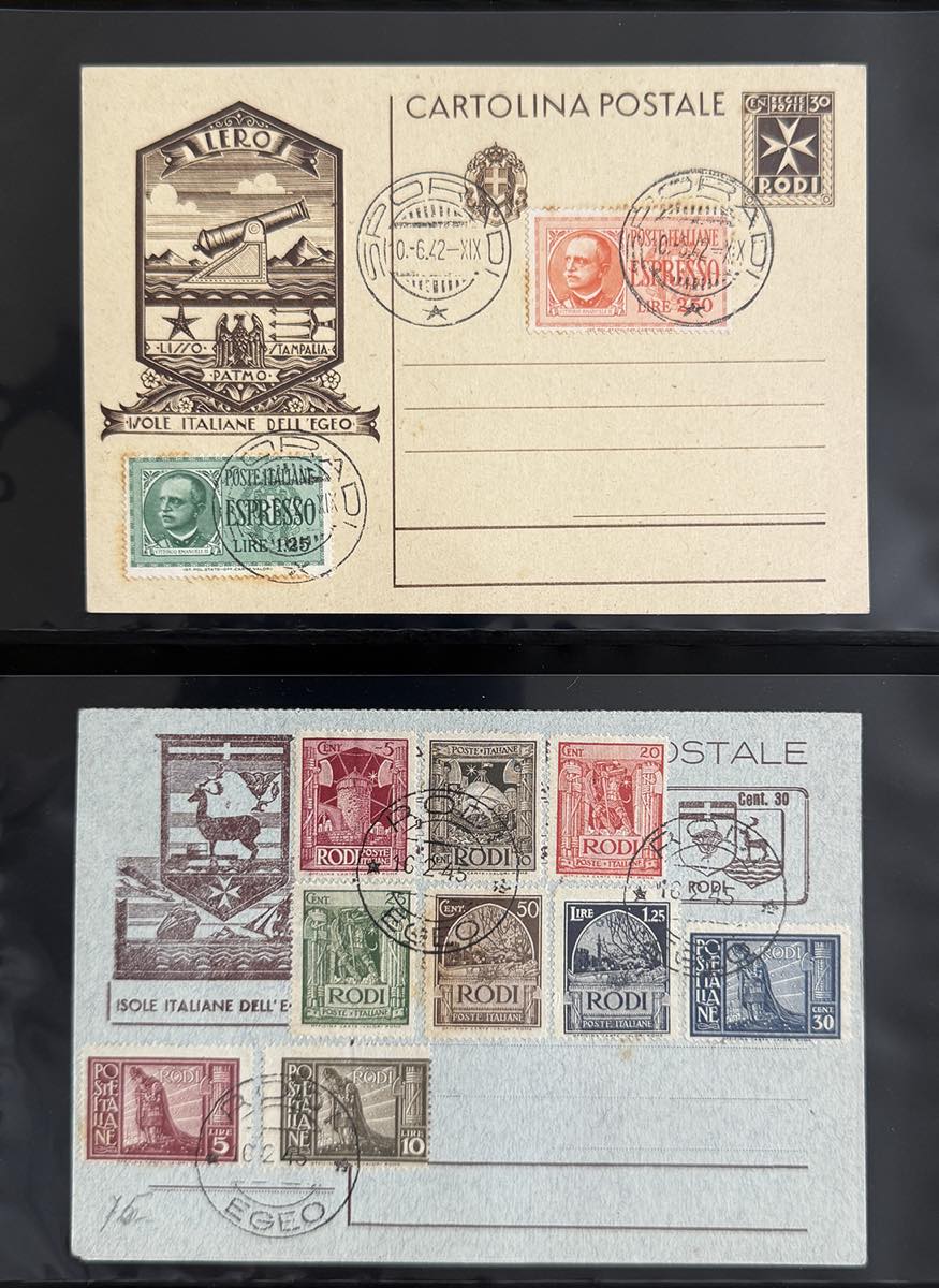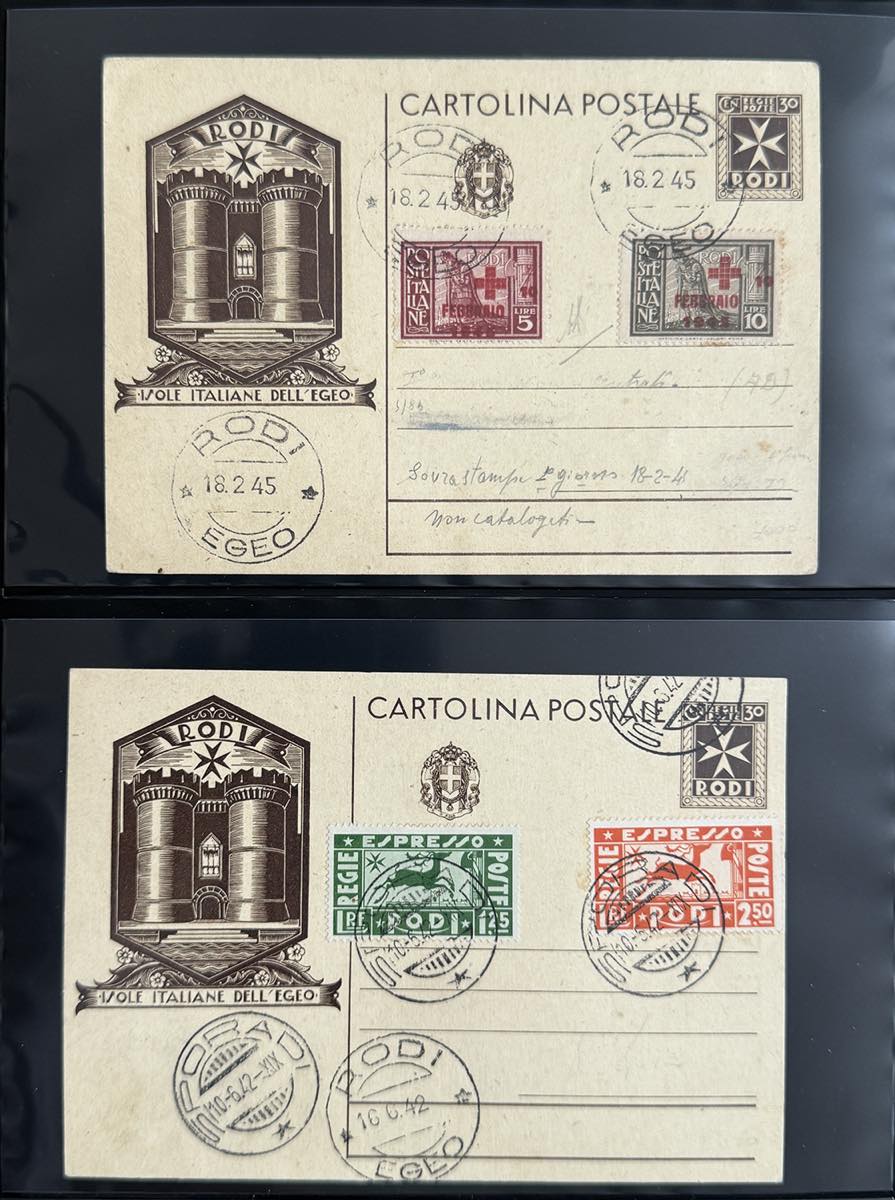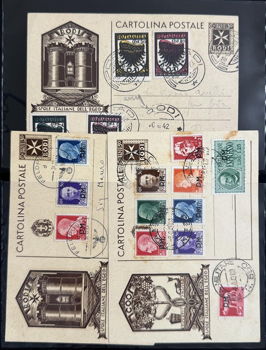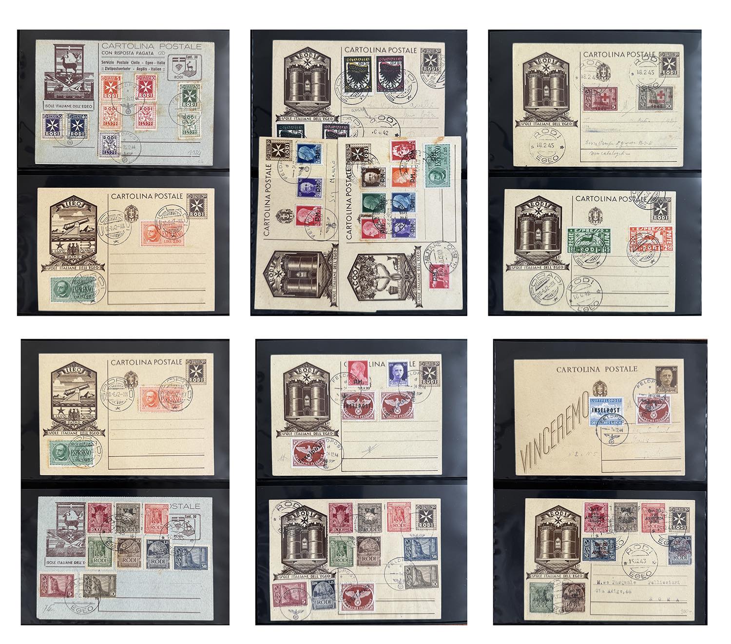 EGEO INTERI POSTALI 1942/1944 - Bell'insieme di 13 cartoline postali con affrancature aggiuntive tra cui Pro Assistenza Egeo e Inselpost. Annulli di pregio, tra cui: Feldpost, Sporadi e Cicladi. Insieme non comune.