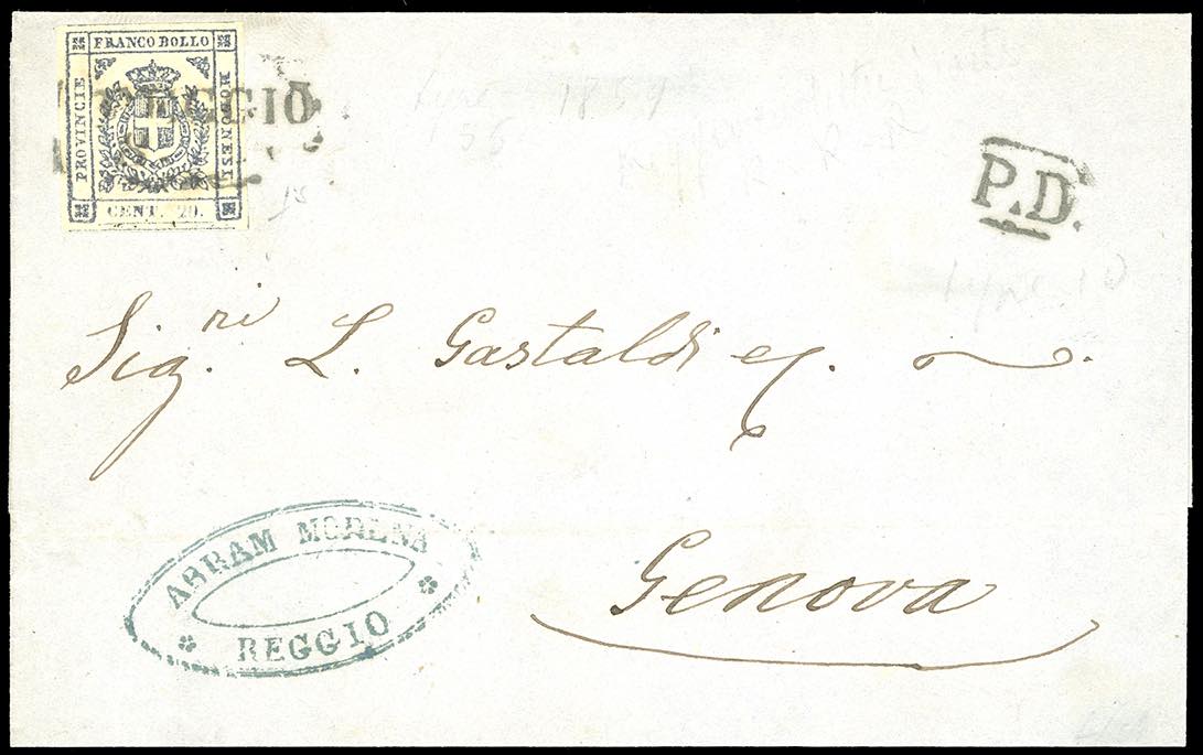 1859 - Lettera da Reggio a Genova dell'8/11/1859 affrancata in tariffa di primo porto con 20 cent. ardesia violaceo (15), annullato col bollo stampatello diritto fornito durante il Governo Provvisorio. A lato bollo "PD" e al verso bollo di arrivo a Genova del 10 novembre. Non comune, molto bella.