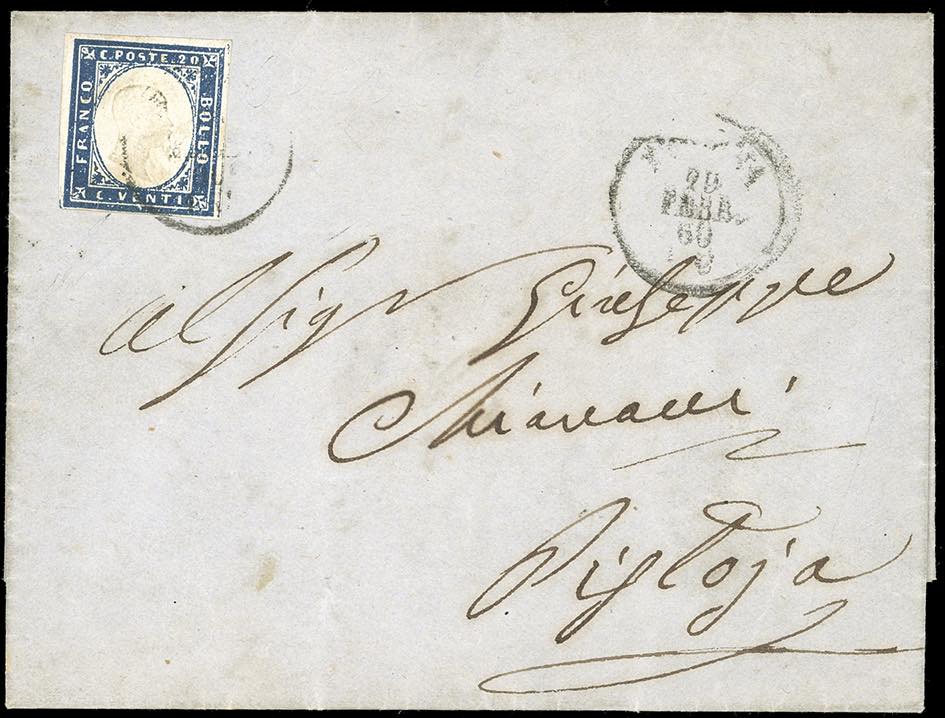 1860 - 20 cent. azzurro (15Ca), piccolo difetto in basso, su lettera scritta a Pavullo ma impostata a Modena 29/2/1860 per Pistoia. Interessante lettera del Cisappennino Modenese con i francobolli sardi nel febbraio 1860.