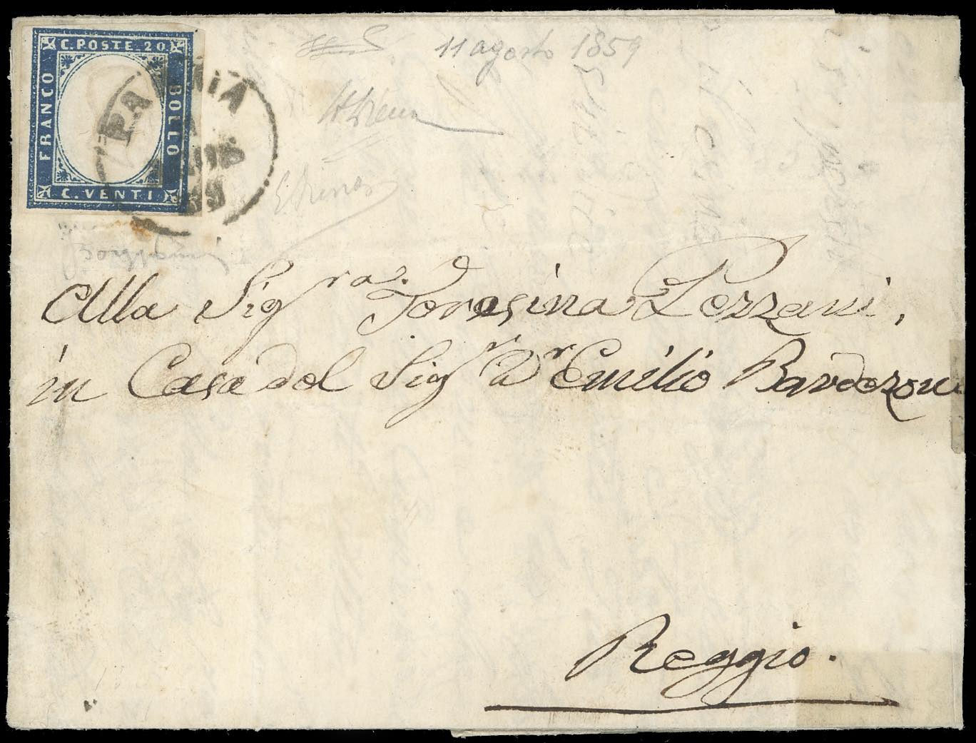 1859 - 20 cent. azzurro scuro IV emissione di Sardegna (A3,15B), perfetto, su lettera da Parma 11/8/1859 a Reggio. Pregevole lettera del I periodo del Governo Provvisorio. Em. e A.Diena, Bargagli, cert. Ferrario.