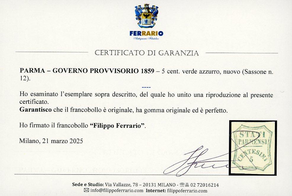 1859 - 5 cent. verde azzurro (12), nuovo, gomma originale, perfetto. Molto fresco. Emilio Diena, cert. Ferrario.