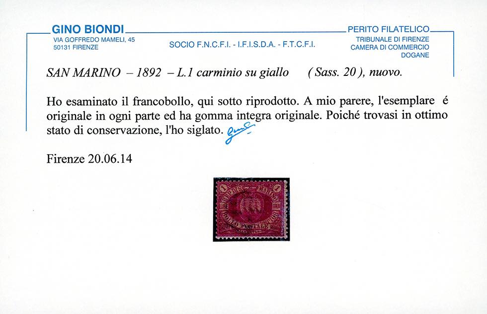 1892 - 1 lira carminio su giallo Stemma (20), nuovo, gomma originale integra, perfetto. Cert. G.Bolaffi.