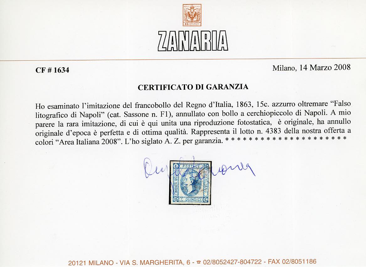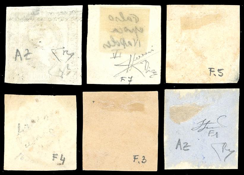 1863 - Eccezionale insieme dei sei falsi del 15 cent. litografico nei vari tipi: 15 cent. azzurro oltremare, posizione 1 della composizione dei falsi litografici curata da Mario Tomasini (F1, cat. Sassone € 9.000), usato, perfetto. Ottima qualità, cert. Enzo Diena, Serra e Zanaria; 15 cent. azzurro verdastro, falso calcografico di Napoli del II tipo (F3 cat. Sassone € 15.000), usato, leggermente difettoso al centro, ampi margini. Cert. Sorani; 15 cent. azzurro verdastro, falso calcografico di Napoli del III tipo (F4 cat. Sassone € 15.000), usato, leggermente difettoso in alto a destra. Cert. Sorani; 15 cent. azzurro verdastro, falso calcografico di Napoli del IV tipo (F5 cat. Sassone €-), usato, piccolo assottigliamento al verso in basso a sinistra, ampi margini. Il Sassone cita SOLO UN ESEMPLARE NOTO. Cert. Sorani; 15 cent. azzurro verdastro, falso calcografico di Napoli del VI tipo (F7 cat. Sassone €-), usato, perfetto. Splendido. Si conoscono SOLO QUESTO ESEMPLARE ed un altro usato su frammento. Enzo Diena, Cert. Sorani; 15 cent. grigio ardesia, falso calcografico dell'Aquila (F8 cat.Sassone € 6.500), usato, perfetto. Bellissimo. Cert. Enzo Diena, Serra e Zanaria.