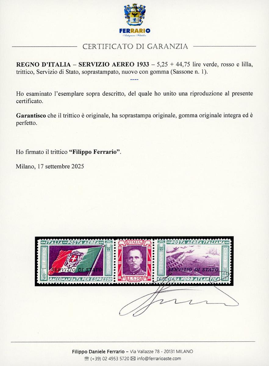 1933 - 5,25 + 44,75 lire Trittico Servizio di Stato (1), nuovo, gomma originale integra, perfetto. Molto fresco. Ferrario. Cert. Ferrario.