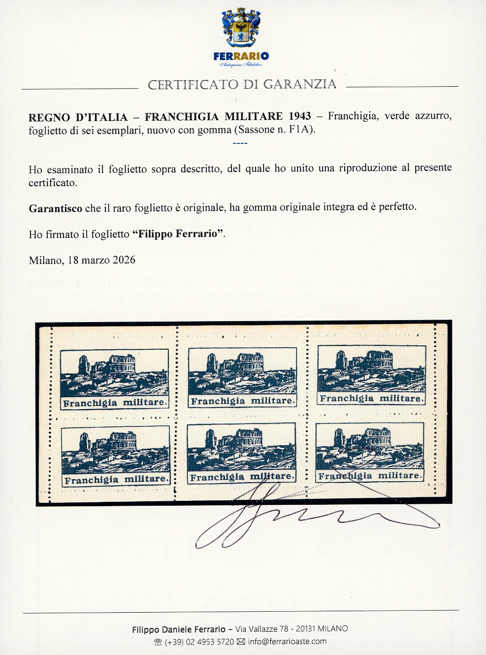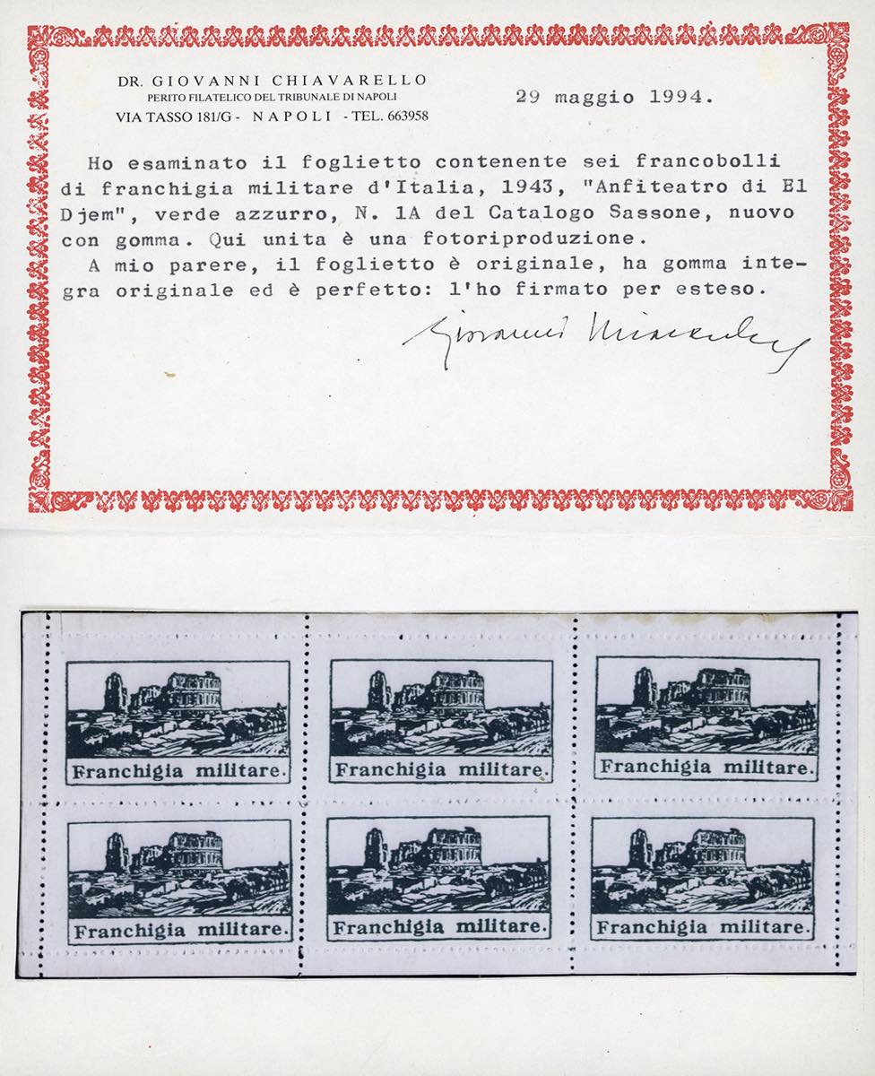 1943 - Foglietto El Djem, verde azzurro (F1A), nuovo, gomma originale integra, perfetto. Splendido e molto raro, pochi esistenti. Cert. Chiavarello e Ferrario.