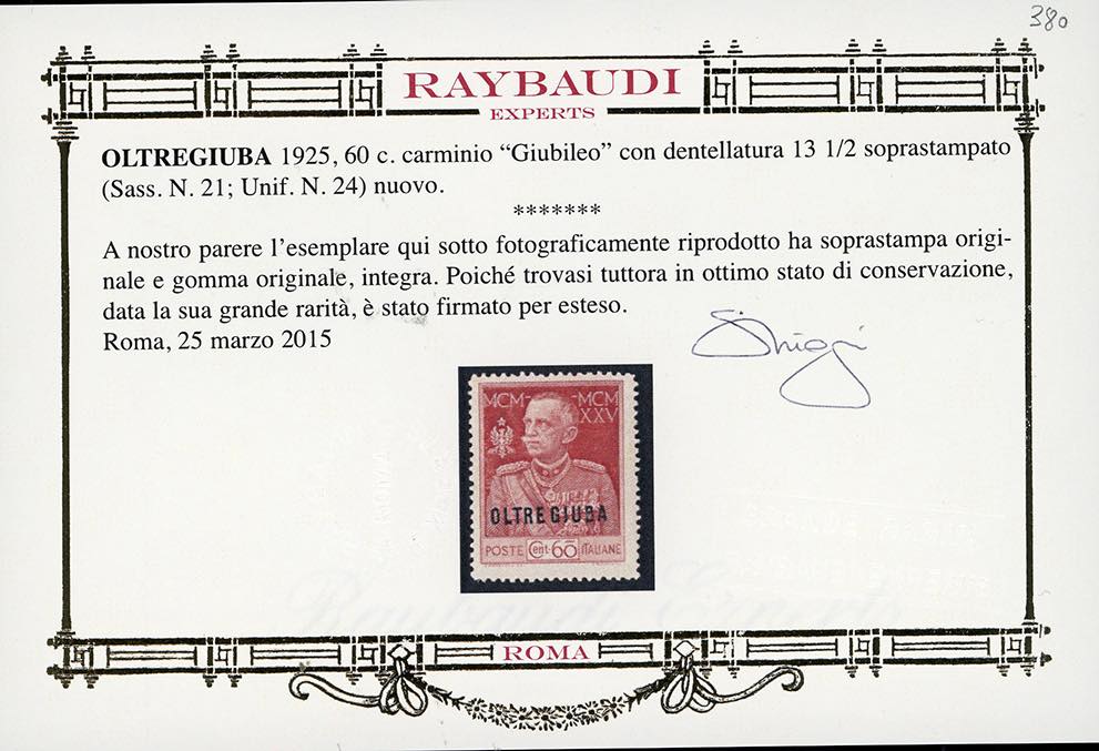 1925 - 60 cent. Giubileo, dent. 13 1/2 (21), nuovo, gomma originale integra, perfetto e molto fresco. Raro. Cert. Oro Raybaudi.