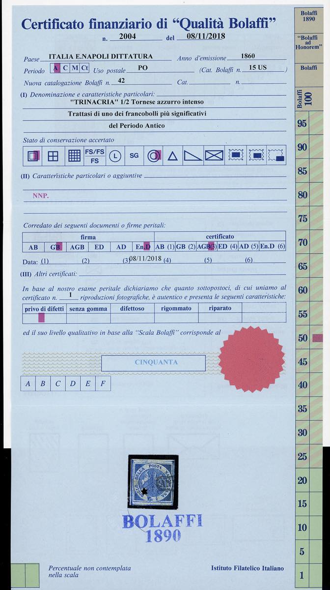 1860 - 1/2 tornese azzurro Trinacria (15), usato con annullo leggero, perfetto e colore molto vivace. Molto bello. Firmato Emilio Diena, Enzo Diena, Giorgio Colla e Giulio Bolaffi, cert. finanziario Bolaffi.