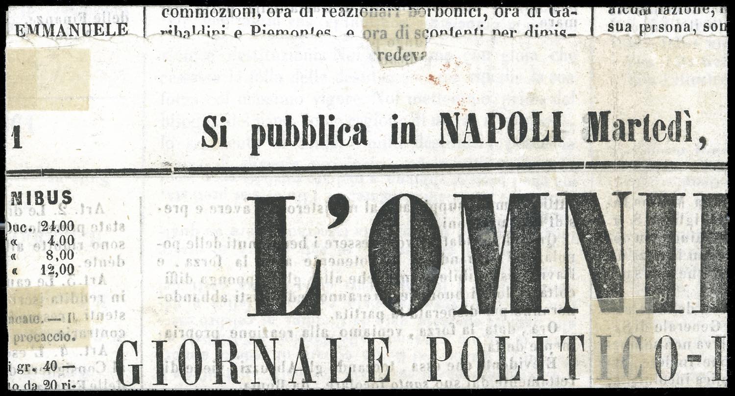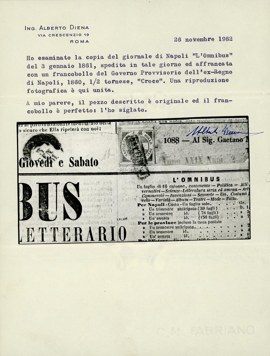 1860 - 1/2 tornese azzurro Crocetta (16), perfetto, ampi margini, su giornale "l'Omnibus" del 3/1/1861, quasi completo. Insieme di ottima qualità. Firmato Luigi Raybaudi e Giulio Bolaffi, cert. Alberto Diena.
