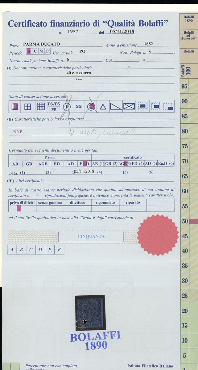 Lot 42 - 1852 - 40 cent. azzurro (5), nuovo, gomma originale, ...