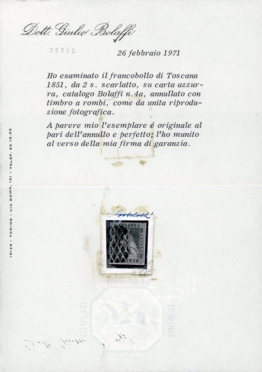 1851 - 2 soldi scarlatto su azzurro (3), usato, perfetto e ben marginato. Bello e raro. A.Diena, cert. G.Bolaffi.
