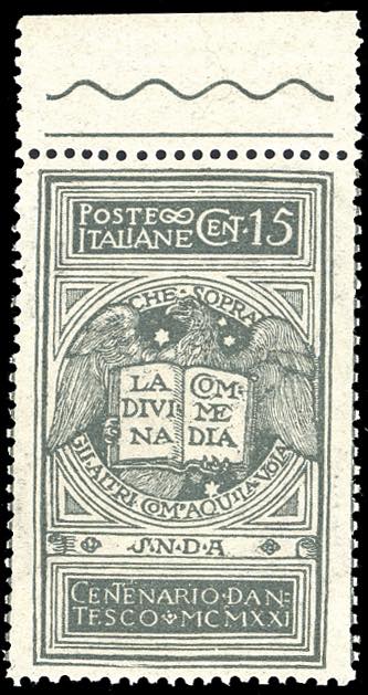 1921 - 15 cent. grigio Dante, errore di colore, non emesso (116A), centratura eccezionale, bordo di foglio in alto, nuovo, gomma originale ... Read more