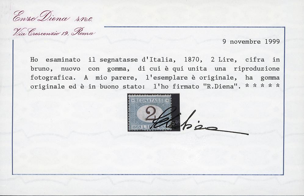 1870 - 2 lire azzurro chiaro e bruno (12), buona centratura, nuovo, gomma originale, buono stato. Cert. Diena.