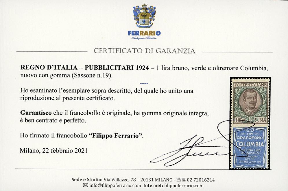 1924 - 1 lira Columbia (19), ben centrato, nuovo, gomma originale integra, perfetto. Molto fresco e di ottima qualità. Mondolfo, cert. ... Read more