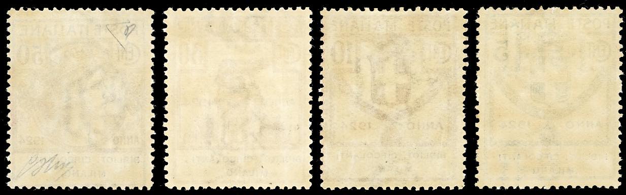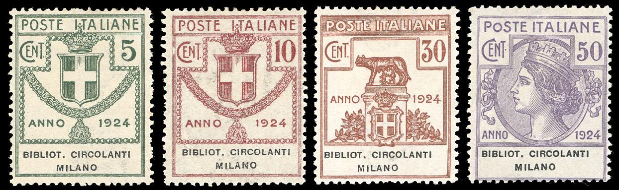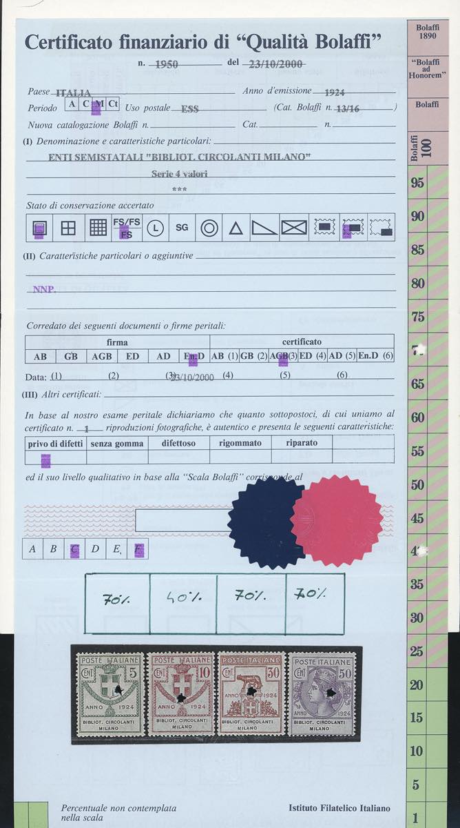 BIBLIOT.CIRCOLANTI MILANO 1924 - Serie completa (13/16), nuovi, gomma originale integra, perfetti e molto freschi. E.Diena e G.Oliva per l'alto valore, cert. finanziario Bolaffi per la serie.
