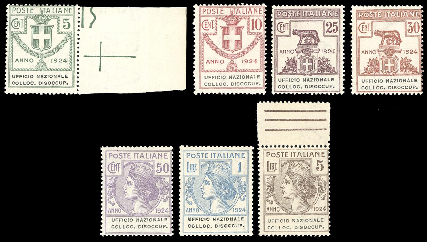 UFFICIO NAZIONALE COLLOC.DISOCCUP. 1924 - Serie completa (62/68), nuovi, gomma originale integra, perfetti. E.Diena per l'alto valore.