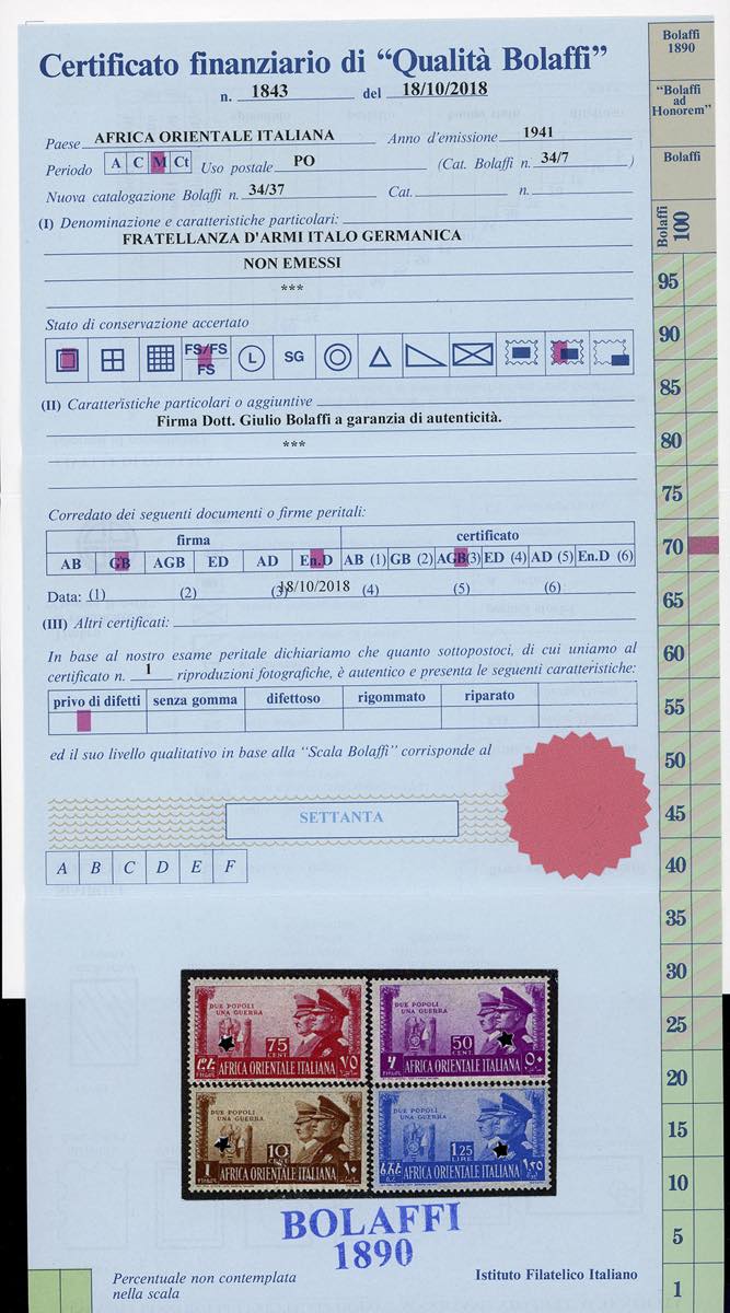 1941 - Fratellanza d'armi, non emessi, serie completa (41/44), nuovi, gomma originale integra, perfetti e molto freschi. Ottima qualità. Rari, tiratura 100 serie. Firmati Giulio Bolaffi, Enzo Diena, cert. finanziario Bolaffi.
