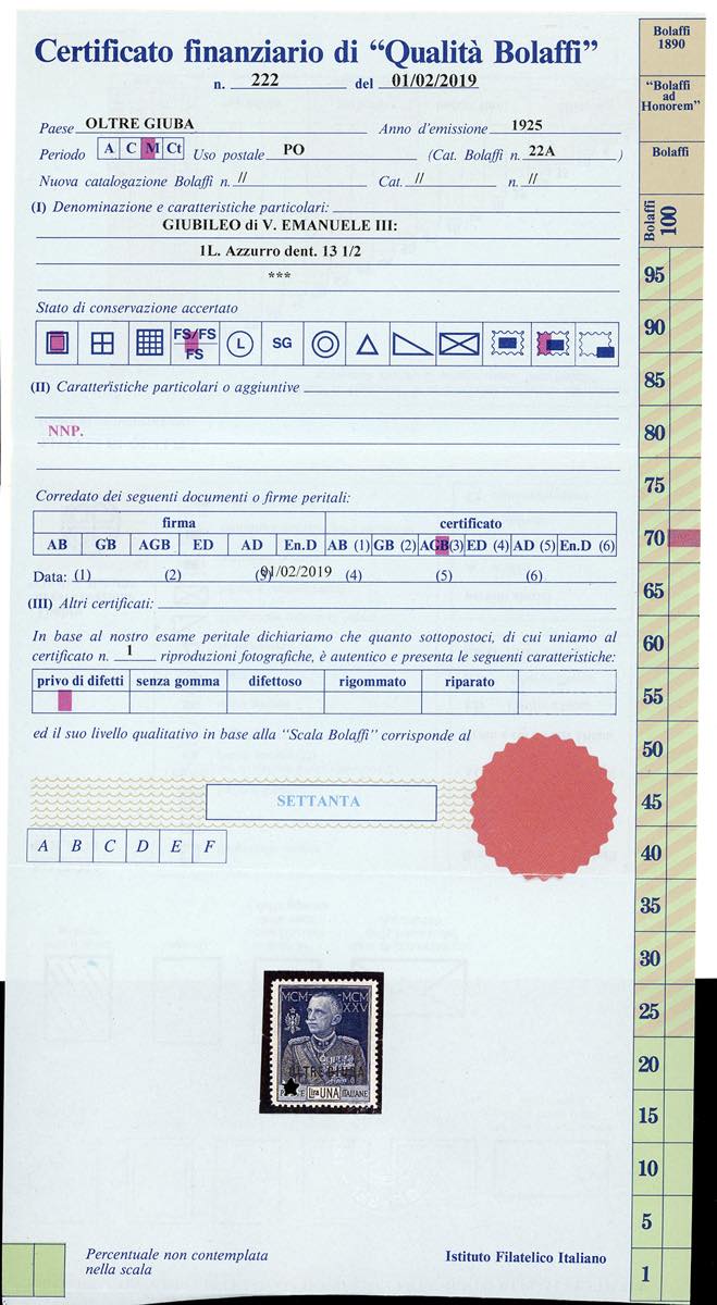 1925 - 1 lira Giubileo, dent. 13 1/2, soprastampato (22), nuovo, gomma originale integra, perfetto e molto fresco. Ottima qualità. Cert. finanziario Bolaffi.