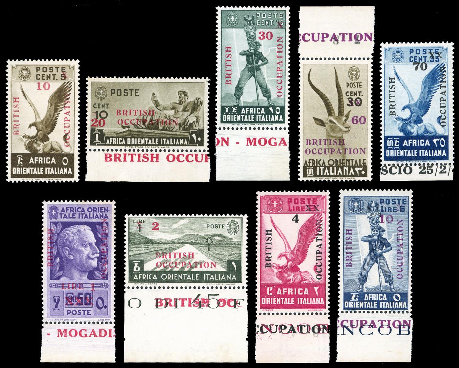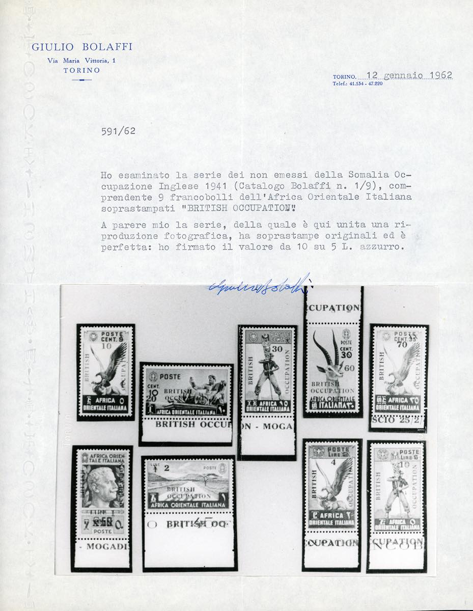 OCCUPAZIONE BRITANNICA AFRICA ORIENTALE 1941 - Soprastampati serie completa, non emessi (1/9), gomma originale integra, perfetti. Cert. G.Bolaffi.