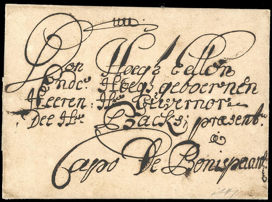 SUD AFRICA/CAPO DI BUONA SPERANZA 1676/78 - Lettera priva del testo interno indirizzata a Capo di Buona Speranza, al Comandante del Forte (Governatore della Colonia), Johan Bax Van Herenthals, in carica tra il 1676 e il 1678. Interessante e rara. Cert. "Parola scritta" Bolaffi.