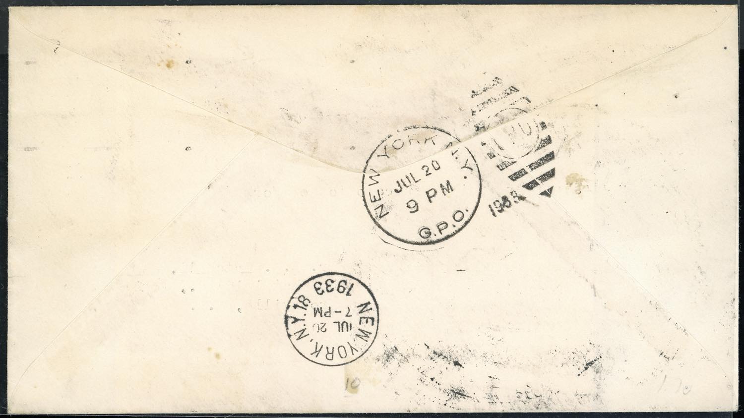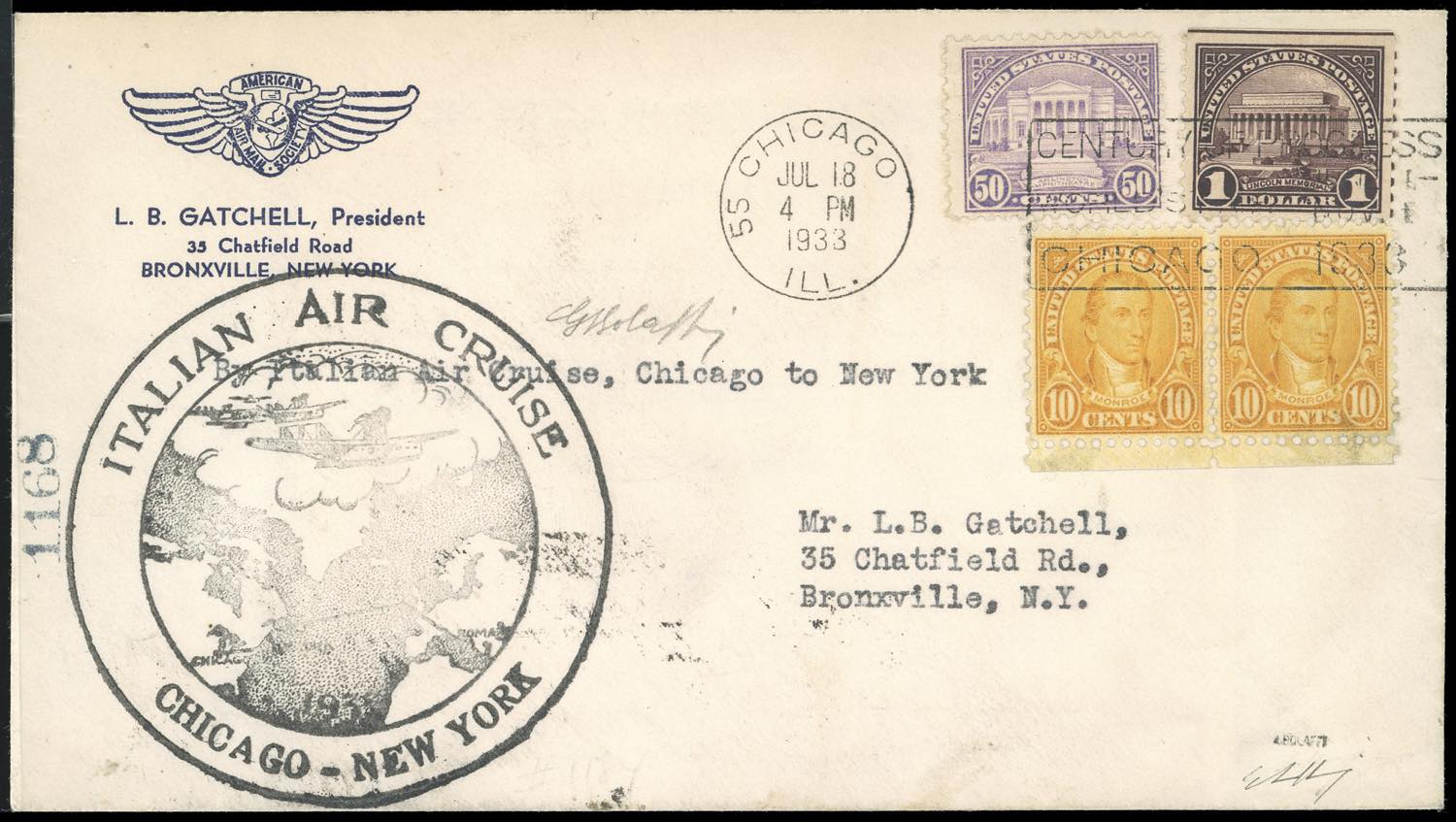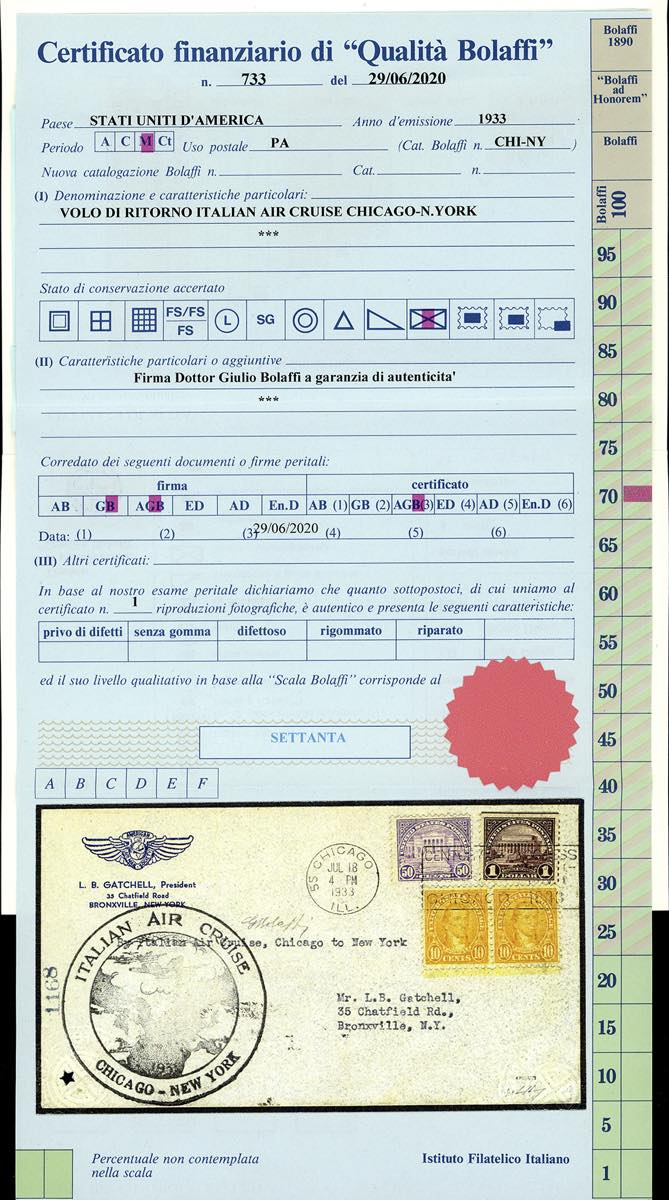 STATI UNITI POSTA AEREA 1933 - Crociera Nord Atlantica di Balbo, l'aerogramma del volo di ritorno, tappa Chicago-New York, bollo d'arrivo del 20/7/1933. Francobolli perfetti. Ottima qualità. Firmato Giulio Bolaffi, cert. finanziario Bolaffi.