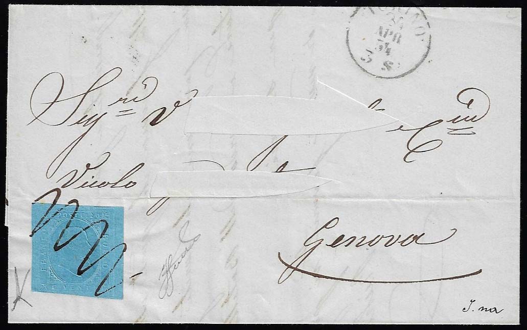 TORINO, a penna punti 13 - 20 cent. (5), bordo di foglio, intaccato in basso, su lettera del 24/4/1854 per Genova. Rarissimo annullamento sottoquotato, insieme probabilmente unico! Ferrario, cert. Bottacchi.