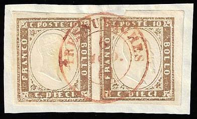 TRESNURAGHES, rosso punti 13 - 10 cent. (14Co), ottimo stato, usato su piccolo frammento il 6/8/1861. G.Bolaffi.