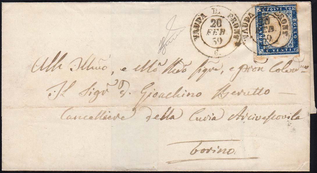 VAUDA DI FRONT, doppio cerchio rosetta, punti R3 - 20 cent. azzurro scuro (15B), corto a destra, su fresca sovracoperta di lettera del 20/2/1859 per Torino, bollo d'arrivo. Annullamento nitido ed estremamente raro! Ferrario (cat. Sassone € 33.750/75.000).