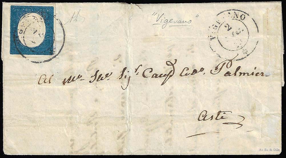 VIGEVANO, punti 9 - 20 cent. azzurro (8),ben marginato, su lettera da Vigevano 2/12/1854 ad Asti. A.Diena.