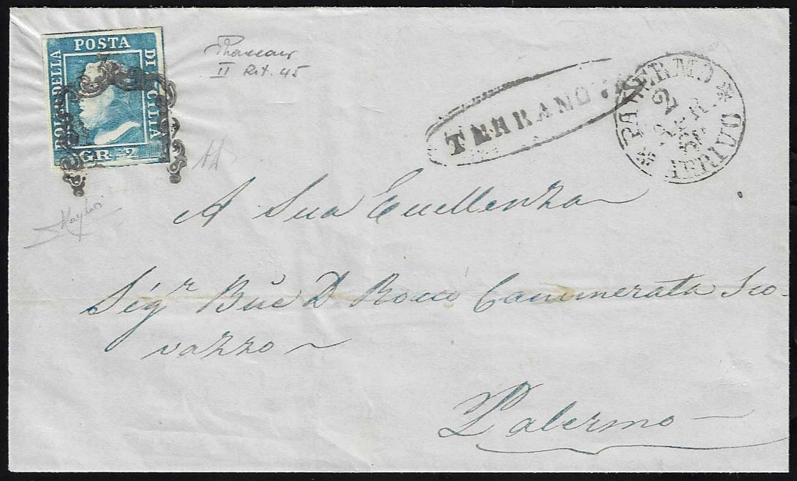 1860 - 2 grana azzurro, II tavola, ritocco 45 (7), perfetto, su sovracoperta di lettera da Terranova (punti 6) a Palermo. Bella! A.Diena, Raybaudi, Vaccari.