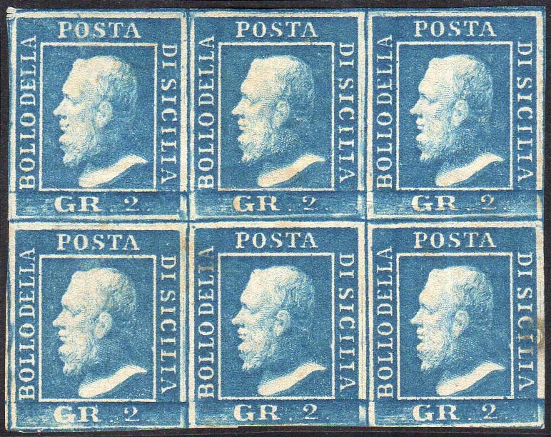 1859 - 2 grana azzurro verdastro, III tavola, carta di Napoli (8b), eccezionale blocco di sei, ben marginato. Quattro esemplari con lievi ... Leggi tutto