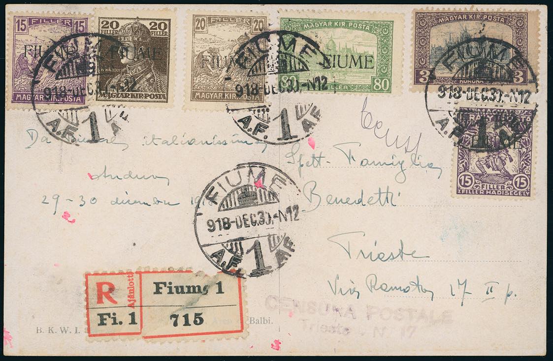 Lotto 583 - FIUME 1918 - Cartolina raccomandata con affrancatura sei ...