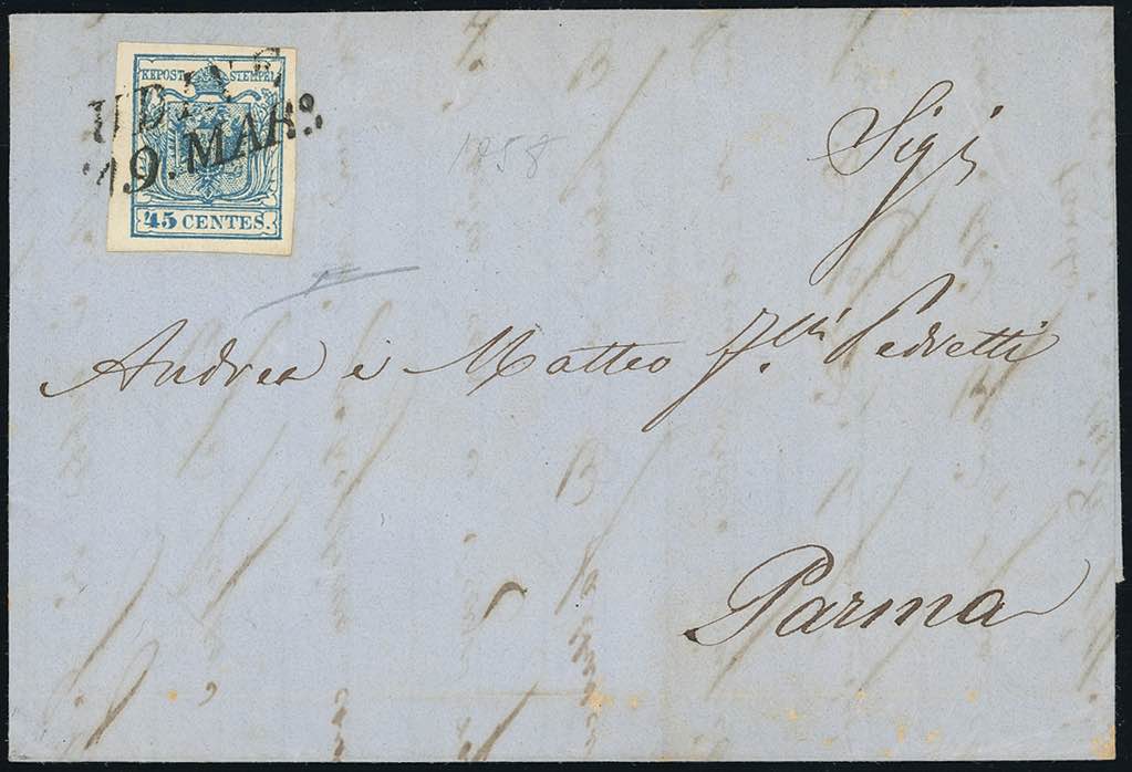 1858 - 45 cent. carta a macchina (22), perfetto, su lettera da Udine 19/3/1858 a Parma. Bella. R.Diena.
