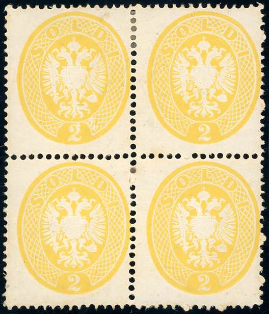 Lotto 109 - 1863 - 2 soldi giallo, dent. 14 (36), blocco di quattro, ...