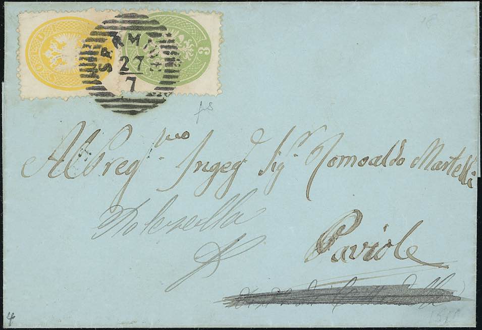 1863 - 2 soldi giallo e 3 soldi verde, dent. 14 (36,37), perfetti, su sovracoperta di lettera da Sermide 27/7 a Paviole. Bella. Fiecchi.