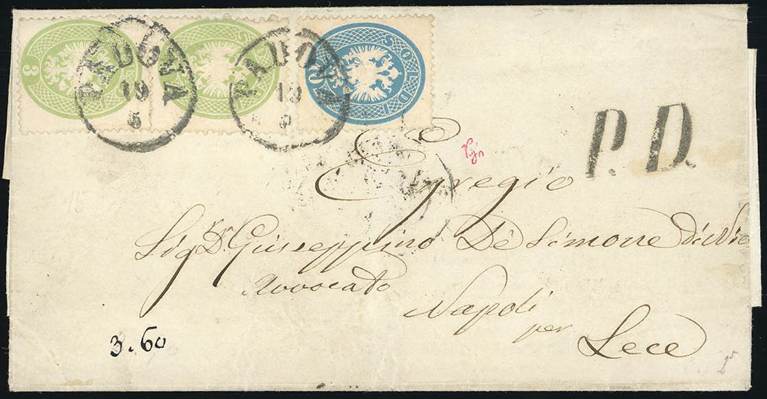1864 - 3 soldi verde, due esemplari, 10 soldi azzurro, tutti dent. 14 (37,39), perfetti, su sovracoperta di lettera da Padova 19/5 a Lecce.