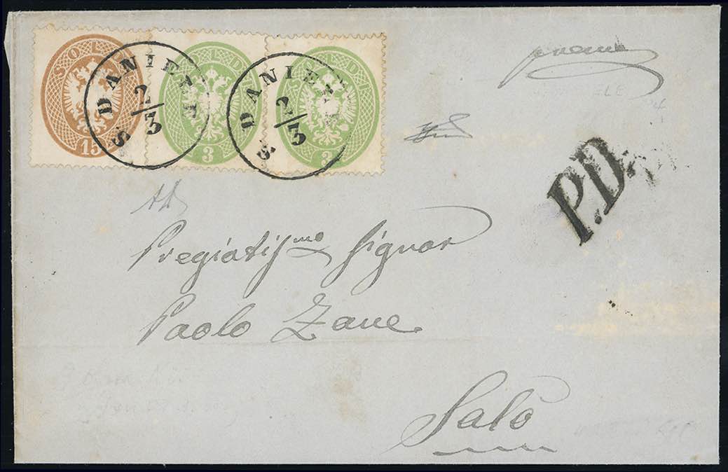 1864 - 15 soldi bruno, 3 soldi al verso, due esemplari, dent. 14 (40,37), perfetti, su sovracoperta di lettera da San Daniele 2/3/1864 a ... Leggi tutto