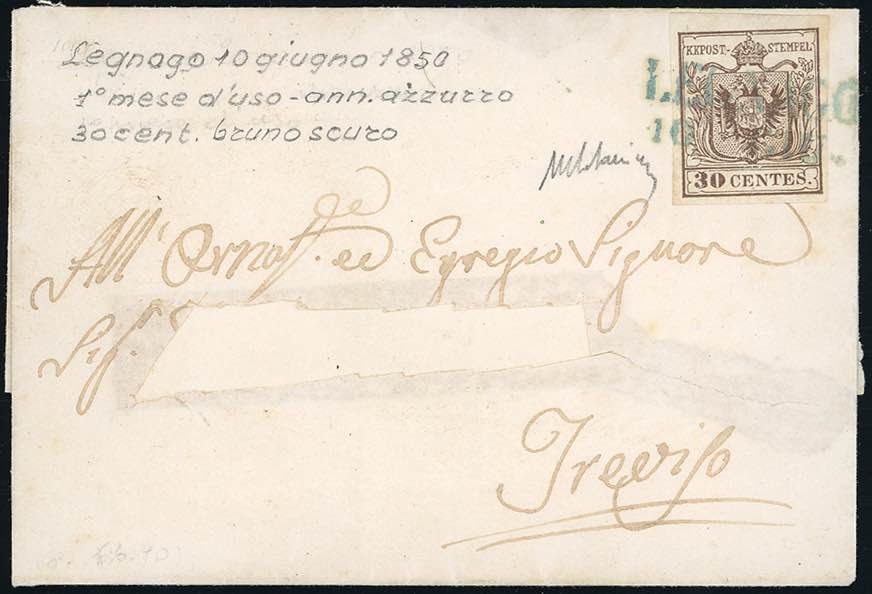 LEGNAGO, SD azzurro punti 12 - 30 cent. (7c), perfetto, su sovracoperta di lettera, indirizzo parzialmente ritagliato, del 10/6/1850, primo mese d'uso, per Treviso. Rara.