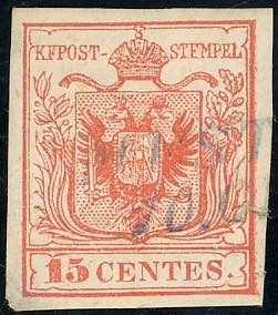 MESTRE, SI azzurro punti R2 - 15 cent. I tiratura (3a), assottigliato e con un piccolo strappo, usato il 10/6/1850. Molto raro. R.Diena.