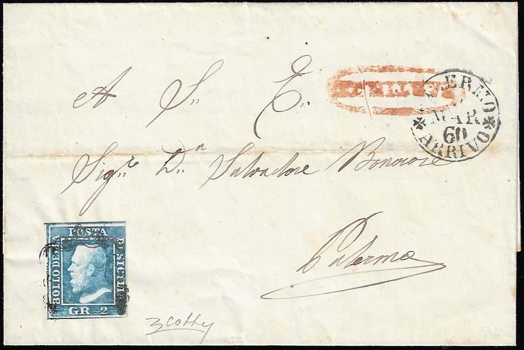 PARTINICO, ovale rosso punti 13 - 2 grana (8d), perfetto, su sovracoperta di lettera per Palermo 18/3/1860. Cert. Colla.