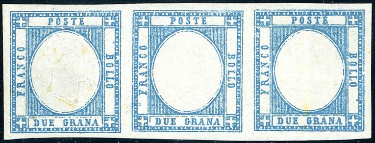 1861 - 2 grana azzurro chiaro, striscia di tre, il primo esemplare con effige, gli altri senza (20i), l'ultimo esemplare con lieve piega ... Leggi tutto