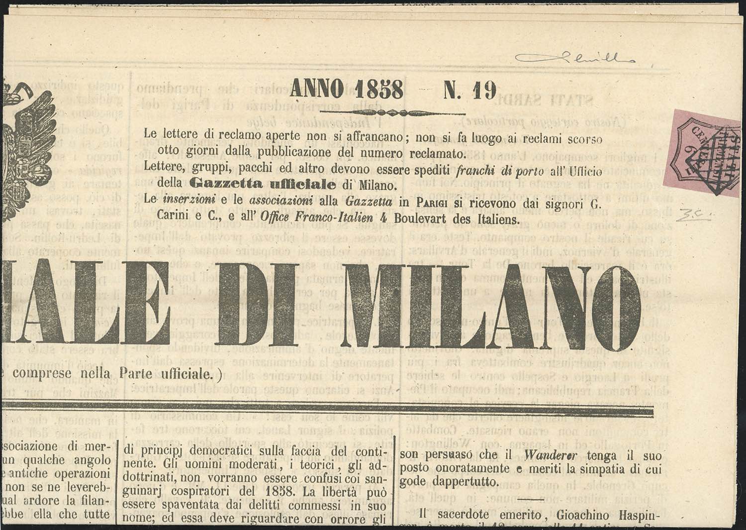 1858 - 6 cent. rosa vivo (1), corto in alto, annullato con bollo muto a griglietta su giornale "Gazzetta Ufficiale di Milano" del ... Leggi tutto