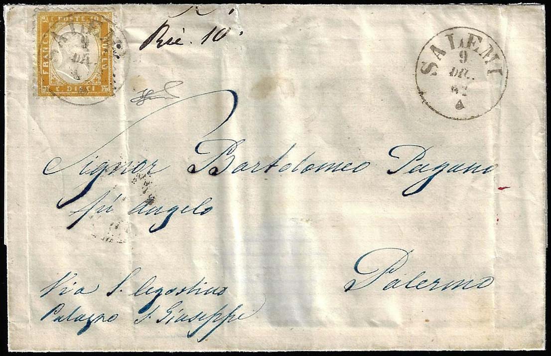 SALEMI, cerchio su Regno I emisisone, punti 12 - 10 cent. bistro giallastro (1), perfetto, su fresca lettera del 9/12/1862 per Palermo. ... Leggi tutto