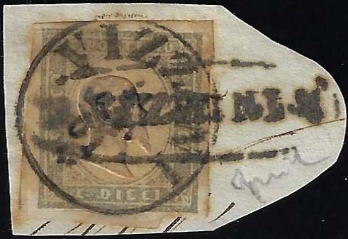 VIZZINI ovale con fregi (punti R2), + cerchio (punti 7), combinazione inedita e non catalogata - 10 cent. (14C), perfetto, usato su frammento con i due bolli coannullatori borbonico e sardo italiano. Insieme unico. Ferrario, ex collez. Nino Aquila.