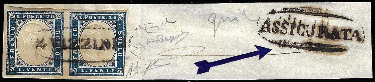 VIZZINI ovale con fregi + ASSICURATA punti -1861 - 20 cent. azzurro scuro (15C), coppia orizzontale leggermente corta a destra, su ampio frammento con il bollo accessorio "ASSICURATA". Si tratta dell'unico caso noto di tale combinazione di annulli borbonici, citato dal Sassone, ma non quotato. Da ritenersi un R3. Alberto, Enzo Diena, Raybaudi, cert. R.Diena. Ex collez. Nino Aquila.