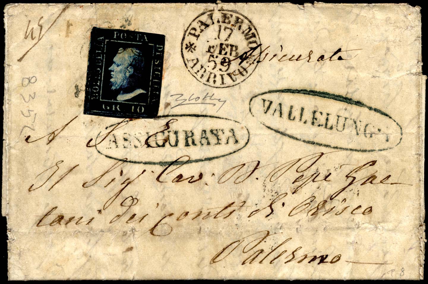 VALLELUNGA, ovale s. f. e assicurata, punti R1 - 10 grana indaco (12b), margini rasenti, isolato su lettera del 17/2/1859 per Palermo. Cert. Colla.
