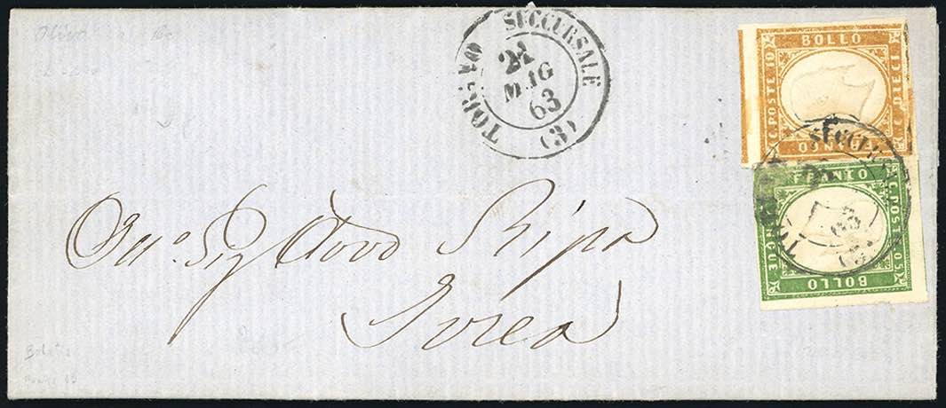1863 - 10 cent. bistro, stampa del bordo inferiore mancante, 5 cent. verde (14E,15E), perfetti, su lettera da Torino 21/5/1863 a Ivrea. ... Leggi tutto