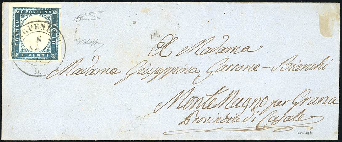 1857 - 20 cent. celeste oltremare scurissimo (15i), perfetto, su busta da Carpenetto 8/9/1857 a Montemagno. Bella! G.Bolaffi, cert. Ferrario.