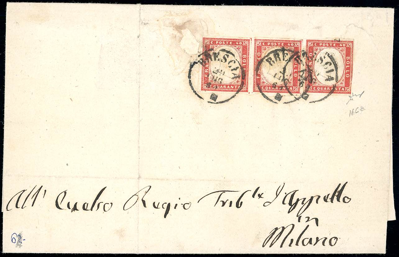 1861 - 40 cent. carminio (16Ca), striscia di tre, difetti, su sovracoperta di lettera da Brescia 20/7/1861 a Milano. Interessante porto ... Leggi tutto